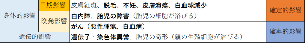表を見ればわかると思いますが、まず「身体的影響」と「遺伝的影響」の2つのカテゴリがあります。