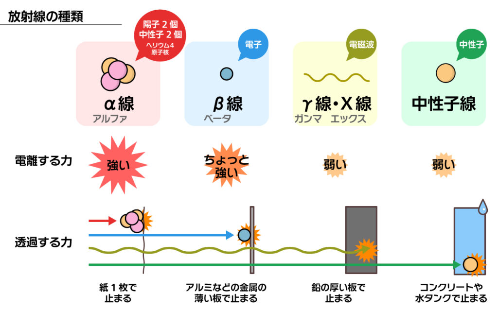 透過力はα線が一番弱く、γ線やX線、中性子線などは強いです。