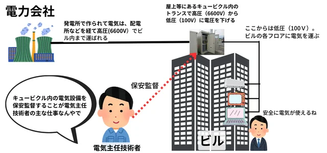 契約電力が大きい建築物では高圧受電し、自家用変電設備(トランス)で低圧に変圧して建物内に給電することが一般的です。自家用変電設備(自家用電気工作物)の場合、保安監督のために電気主任技術者の選任が必要になります。