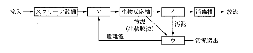 アには流量調整槽、イには沈殿槽、ウには汚泥濃縮貯留槽が入ります。