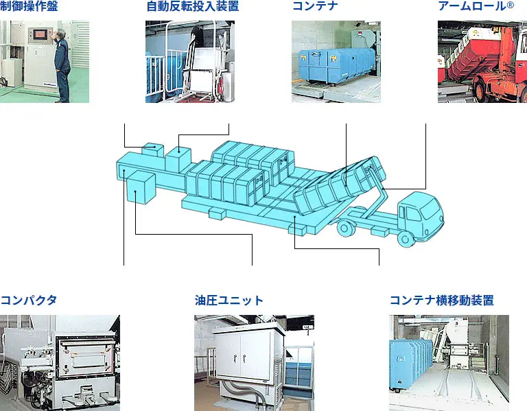 | コンパクタ・ コンテナ方式 | 圧縮機(コンパクタ)によって圧縮された廃棄物をコンテナ内に貯留し、コンテナごとトラックによって搬出する方式。 初期コストは高いがランニングコストが低く設置スペースも少ない。大規模建築物に導入。 | 初期コスト:△ ランニングコスト:◎ 所要人員:〇 衛生性:◎ 防災性:◎ 作業性:◎ 設置スペース:◎ |
