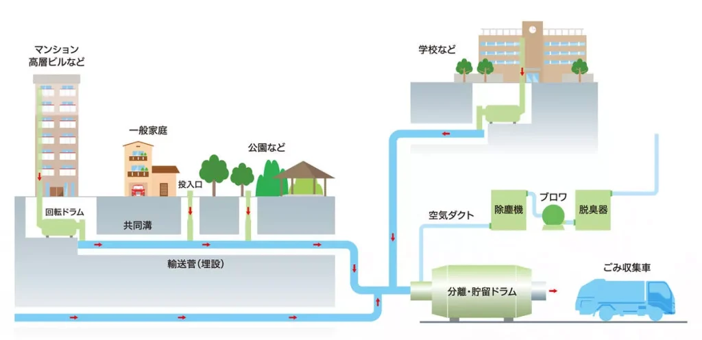 | 真空収集方式 | 建物のダストシュートとごみ収集所を輸送管で結び、管内の空気を収集所側から吸引することにより、ごみを空気と一緒に搬送する方式。 初期コストがかなり高いが、所要人員が少ない。広域大規模開発地域に導入。 | 初期コスト:× ランニングコスト:△ 所要人員:◎ 衛生性:◎ 防災性:△ 作業性:◎ 設置スペース:〇 |
