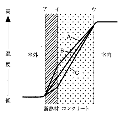 | 1. | 温度分布はAとなり、壁内結露の防止のためにアに防湿層を設けることは有効である。 | ||