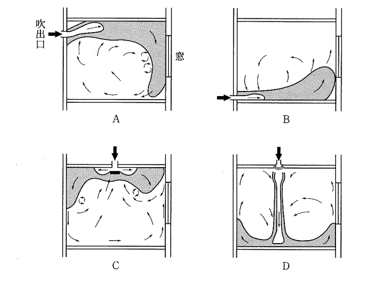下の図は、冷房時の各種吹出方式による室内気流を示したものである。一般的に、冷房時に好ましい方式の室内気流の組合せとして、最も適当なものは次のうちどれか。