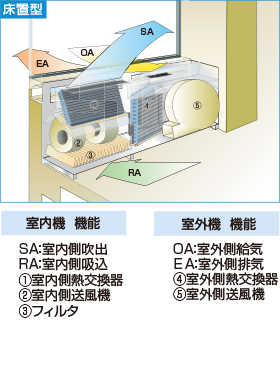 - 中央方式:冷凍機やボイラなどの熱源を機械室などに集約して、ダクトを使って複数個所に冷風や温風を運ぶ方式。