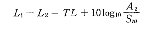ただし、L1、L2は音源室、受音室の平均音圧レベル[dB]、A2は受音室の等価吸音面積[m2]、Swは音の透過する隔壁の面積[m2]、TLは隔壁の音響透過損失[dB]を表す。